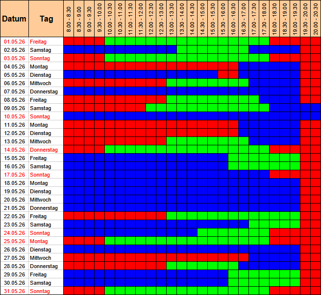 - blau = vermietet – geschlossen für Übende