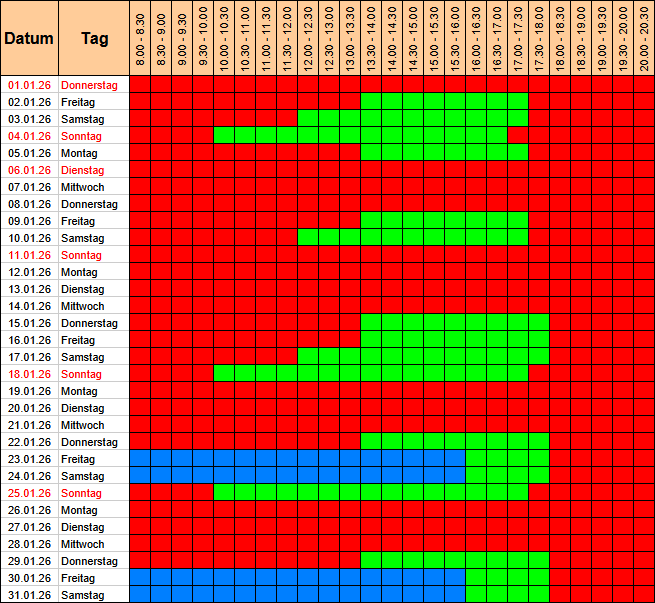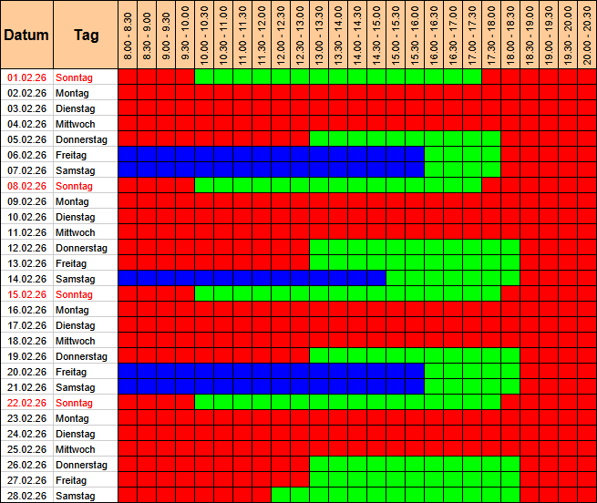 - blau = vermietet – geschlossen für Übende