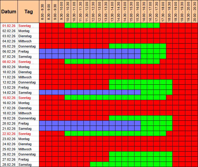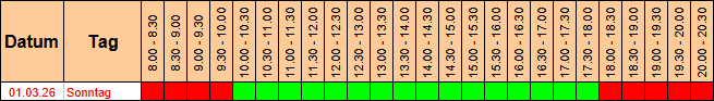 Bitte richten Sie sich nach den in der ⇒ Platzbelegung dargestellten grünen Kästchen (geöffnet).